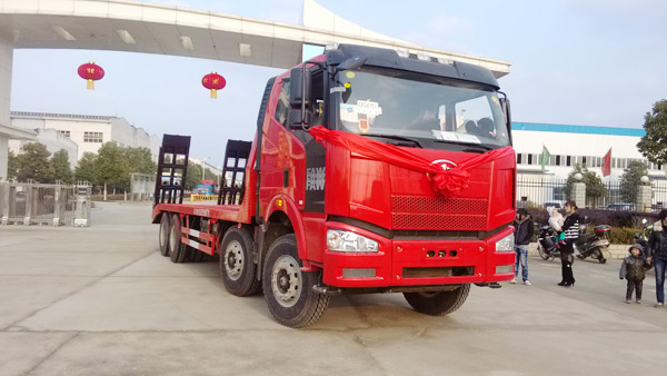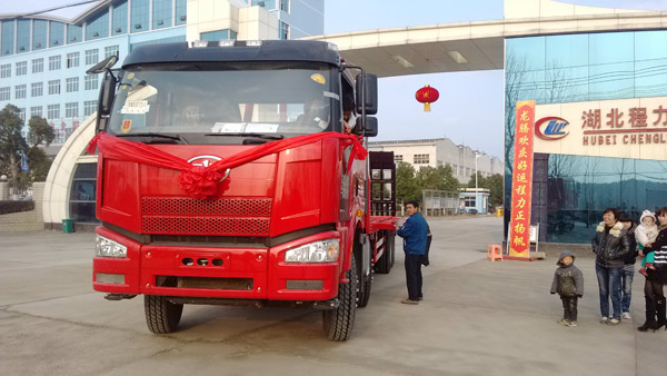 該車于年前客戶定購,于今天昨日交付給客戶,因為在客戶在我公司辦理分期付款業務,在我市上戶,年檢也在我市,客戶對我們說:“其實上我市的牌照還省心些,上客戶當地的牌照年審還要季審,年審,費用也需要3000多,還不如一次性交由我公司來年審,省時省心!”。今天客戶在我市辦理上牌手續及辦理營運證。于晚上客戶提車走。客戶對這輛解放J6前四后八平板運輸車非常滿意。