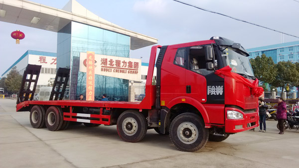 解放J6前四后八平板運輸車采用解放錫柴330EGR馬力發動機改裝,帶制動。