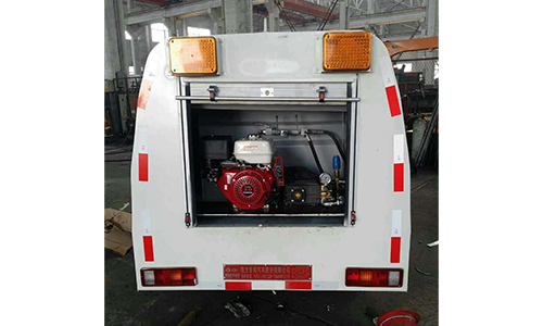 該車(chē)輛型號(hào)CLW5020GQXC4,選用的是解放汽油機(jī)底盤(pán)2.75米軸距,清洗水箱的容積1.2立方米。車(chē)輛前端有一排帶有10個(gè)高壓沖頭前沖器,車(chē)子選配意大利進(jìn)口的高壓泵,壓力達(dá)到10兆帕,該車(chē)是用于清洗路面,路面的保潔養(yǎng)護(hù),比如臨街餐飲路面上的油漬,城區(qū)路面因轉(zhuǎn)運(yùn)泥土車(chē)的撒漏使泥土粘貼在路面上,以及其他較強(qiáng)力的路面附著物的清洗處理都需要使用該車(chē),除污效果好,省時(shí)省力。