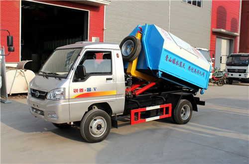車廂可卸式垃圾運輸車(又稱拉臂式垃圾運輸車)是由一輛備有液壓拉臂裝置的底盤和一只可卸式集裝箱組成。液壓拉臂機構可以將放置在地面上的可卸式集裝箱從地面上拖拉到底盤上,或者從底盤上將集裝箱放到地面上。同時可以利用液壓拉臂機構將集裝箱在底盤舉升,使集裝箱內垃圾實現后傾式卸載。車和集裝箱可以像牽引拖掛列車式運輸車一樣分離。車將空集裝箱放下,再拉上滿載集裝箱即可運輸。液壓車廂可卸式機構既可以作為集裝箱上車的拖拉機構,又可作為集裝箱內垃圾后傾式卸載的卸載機構,一舉兩得。
