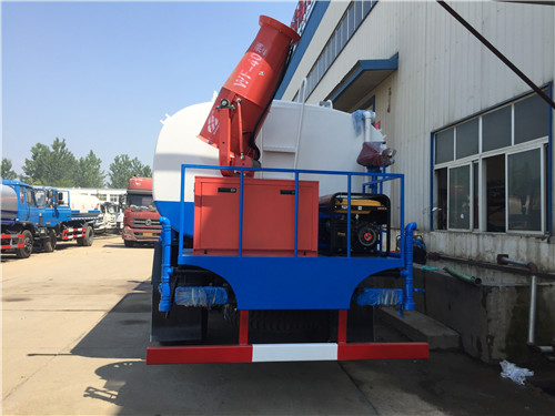 灑水車前裝有鴨形噴嘴或圓頭沖嘴,后面裝有圓柱開灑水噴嘴或蓮蓬頭噴嘴,后部有一工作平臺,裝配有水炮。后部還可裝8個噴嘴(選裝)噴水器一般用于沖洗街道,起除塵和降溫作用,其噴水器可以用調節噴嘴螺紋的方法改變噴水器的噴灑方向和角度,高射水炮可以用于城鄉園林綠化及應急消防。蓮蓬嘴可以澆落路中間噴水器沖起的灰塵,起到清潔空氣的作用。