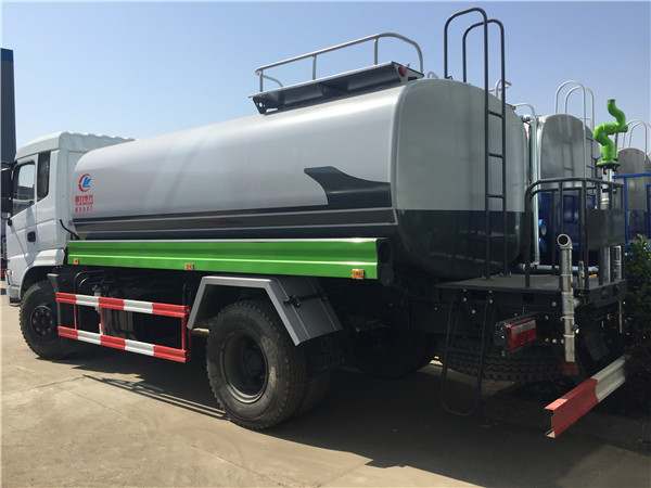 2、新款東風(fēng)專底灑水車標(biāo)配前沖、后灑、側(cè)噴、后工作平臺、綠化炮、自流閥、消防接口、水位計(jì)各1個(gè),輸水管3米2根,罐體右后上方帶花灑2個(gè)。