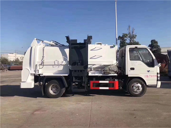 專用配置:由廂體、裝料機構、壓縮機構、卸料機構、油泵、油缸、控制閥等組成的液壓機構組成。廂體材料為優質碳鋼,厚度(單位:mm):邊4底4,廂體容積:5立方,裝料機構由支架,連桿機構,凸輪,掛鉤等組成,在油缸推動下,裝料斗內的垃圾壓縮到廂體內。選裝:1、掛桶翻料機構,2、簸箕翻料機構。壓縮機構由鋼板與槽鋼焊合的壓板,導輪及油缸座等組成,在油缸推動下,將料斗內的垃圾壓縮廂體內。壓縮循環時間:25-30s,壓縮密度:06-0.8Tt/立方,缸料機構由缸料油缸與卸料推板組成,卸料推板由鋼板和支架焊合而成,由導槽定位,由油缸伸長推動卸料推板而卸出垃圾,推卸垃圾時間:40s