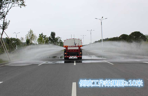 改裝配置:罐體用4MM碳鋼板制作,罐內隔板具有防波作用,以減低汽車行駛時罐體液體的沖擊。整車帶一個專用灑水泵(垂直最大吸程6米),灑水寬度14米,射程28米。多功能灑水車配備2個前沖(噴)(能將路面泥巴、塵土、垃圾沖干凈);2個后灑(能均勻地將水灑在路面,一次灑水寬度14米)、2個側噴(花灑)(能均勻地將路旁綠化帶澆灌)、帶1個后工作平臺,平臺上安裝1個綠化灑水高炮(灑水炮可全方位旋轉,可連續調成直沖狀、大雨、小雨、毛毛雨,霧狀可調節沖洗高大樹木),引水時間<5min,流量90m3/h。帶1個消防接頭,帶1個自流閥,1個過濾裝置、人性化爬梯及側防護欄,安裝灑水音樂喇叭。