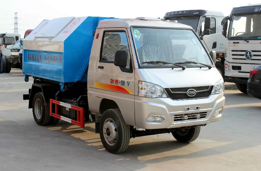 掛桶式垃圾車:垃圾斗固定在車身,可翻起自卸。在車廂一側有提升機,可將垃圾桶掛上自動倒入垃圾箱內。垃圾桶放在路邊或小區,隔一段距離放一個,可放240升350升的塑料桶。