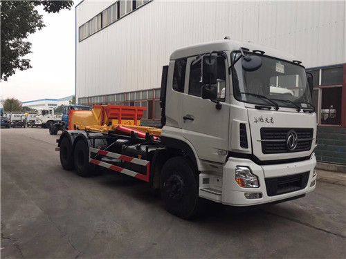 車廂可卸式垃圾運輸車(又稱拉臂式垃圾運輸車)是由一輛備有液壓拉臂裝置的底盤和一只可卸式集裝箱組成。液壓拉臂機構(gòu)可以將放置在地面上的可卸式集裝箱從地面上拖拉到底盤上,或者從底盤上將集裝箱放到地面上。同時可以利用液壓拉臂機構(gòu)將集裝箱在底盤舉升,使集裝箱內(nèi)垃圾實現(xiàn)后傾式卸載。車和集裝箱可以像牽引拖掛列車式運輸車一樣分離。車將空集裝箱放下,再拉上滿載集裝箱即可運輸。液壓車廂可卸式機構(gòu)既可以作為集裝箱上車的拖拉機構(gòu),又可作為集裝箱內(nèi)垃圾后傾式卸載的卸載機構(gòu),一舉兩得。