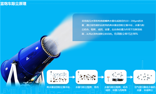 霧炮車又稱為:抑塵車、噴藥車。霧炮車噴射的水霧顆粒達到微米級,能有效分解空氣中的污染顆粒物、塵埃等,在霧霾天氣下用于降塵除霧,可以有效的緩解霧霾,其節水的特性同樣也可以用作灑水車使用。霧炮車還可以降塵、灑水,把樹上的灰塵洗掉。霧炮車噴灑出的水霧與懸浮在空氣中的PM2.5和PM10粉塵顆粒吸附、聚合、沉降,達到消除污染物和減霾的目的。盡管霧炮口徑巨大,但其噴灑耗水量僅為傳統灑水車的兩到三成,覆蓋面積和除塵效率卻高出20倍。既提高效率,也避免路面積水影響交通。