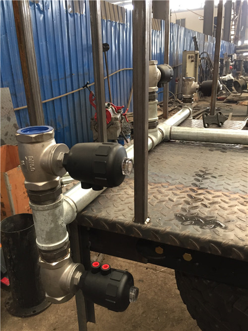 (2)灑水車的管網系統,一般是由一個四位三通球閥、一個單項球閥和一個消防閥門組合而成,不清楚可以看上圖的管網結構示意圖。灑水車抽水的時四位三通球閥的正確開關位置,應該將灑水車專用手柄對到車前(就是該球閥上有一個記號)這個記號對車前,然后再將單項球閥手柄與管網平齊,消防閥門關閉,操作好以后。然后啟動灑水車發動機,讓水泵工作起來,水就會抽入水罐里面了。