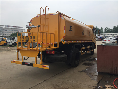 灑水車的工作平臺主要采用花紋防滑板制作而成,防滑板的厚度5毫米,平臺是寬度50-70公分,高度60-80公分,主要是便于工作人員安全操作而設計的尺寸,另外工作平臺上還設計的有腳踏板,便于工作人員上下,平臺上面安裝的綠化灑水炮,主要用于路面沖洗,園林綠化,以及應急消防。綠化灑水炮的工作狀態,可以360度旋轉,射程30米左右,可以調節成大雨、小雨、毛毛雨和柱狀。后灑裝置主要用于路面養護,噴灑寬度15米左右。側噴主要用于公路綠化帶噴灑綠化。