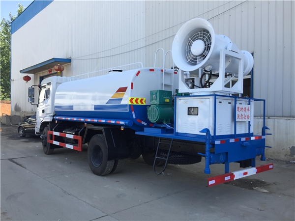 東風(fēng)12噸抑塵車選配50米噴霧機(jī)達(dá)到除塵效果。霧炮機(jī)是根據(jù)風(fēng)送原理,先使用進(jìn)口高壓泵、微細(xì)霧化噴嘴將水霧化,再利用風(fēng)機(jī)風(fēng)量和風(fēng)壓將霧化后的水霧送到較遠(yuǎn)距離,使得水霧到達(dá)較遠(yuǎn)距離同時能夠覆蓋更大面積,水霧與粉塵凝結(jié)后降落,從而達(dá)到降塵目的。