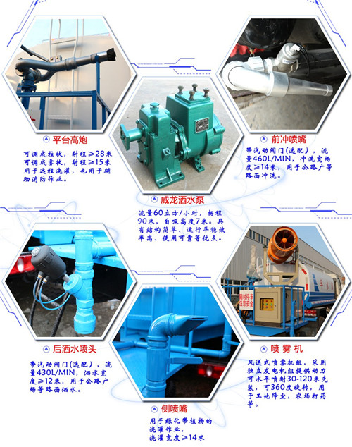 多功能抑塵灑水車又稱消防灑水兩用車、灑水消防兩用車、森林消防灑水車、學校消防灑水車、機場消防灑水車、社區消防灑水、街道及鄉鎮和鄉村消防灑水功能。是一款集消防車和灑水車于一體的兩用車,是介于消防車與灑水車之間,具有消防灑水一體化用途,與消防車相比雖缺少器材箱,但與消防車的射程相同,具有同樣的消防功能。