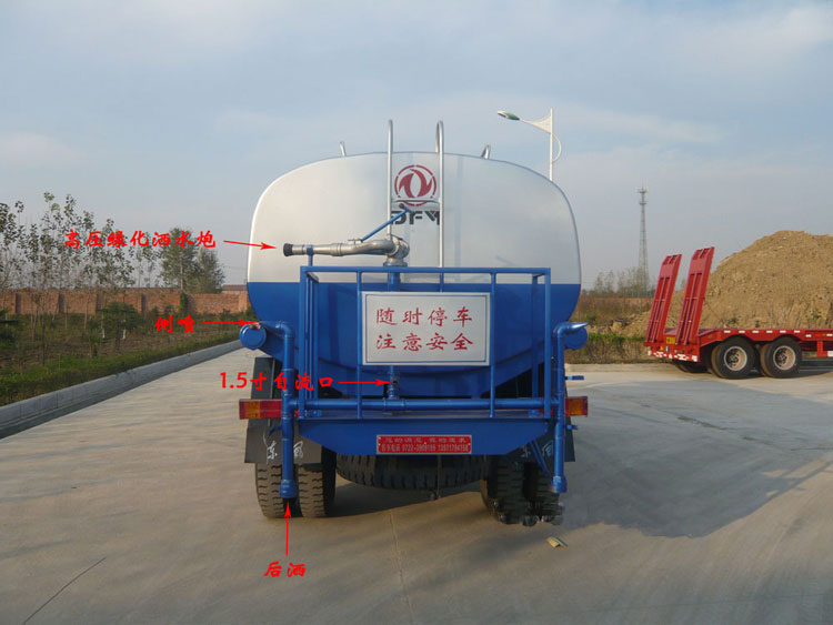 - 灑水車(chē)后灑功能:后灑一般適用于工程路面灑水,如新修的公路為防止路面干燥速度過(guò)快,造成炸裂現(xiàn)象,通常用在新修的路面上鋪設(shè)遮蓋物,并定時(shí)灑水車(chē),以保持新路面的濕潤(rùn)。