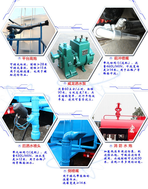 消防灑水車管道系統(tǒng):由“管道、閥門、過濾裝置、出水口(前沖后灑、側(cè)噴;高位側(cè)花灑;后工作平臺(tái),帶綠化灑水高炮)。