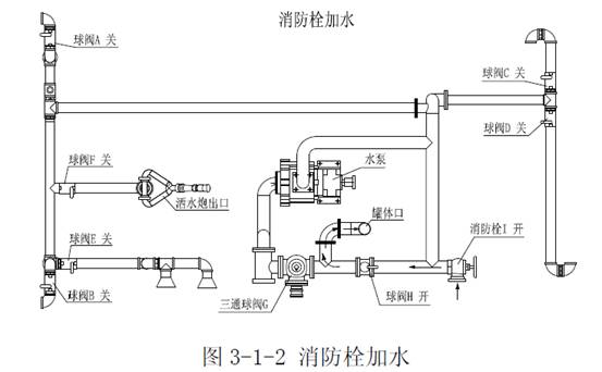 當在野外自采水的情況下,水能通過水泵給罐內供水,其操作程序是:在三通球閥G處接一膠管,調節三通球閥G到如圖位置(注意:三通球閥凹坑所對方向關閉),關閉不銹鋼球閥A、B、C、D、E、F和消防栓I,打開鋁合金球閥H,踏下離合,打開取力器開關,慢慢松開離合(千萬不可過快,否則將會損壞取力器或變速箱),使水泵開始工作,即可向罐內加水,停止工作后開關回位。